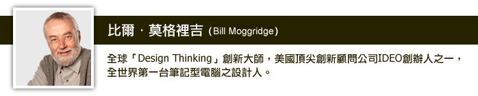 Bill Moggridge 於1981年設計出全球首部手提電腦GRiD Compass,1991年與大衛凱利設計室、Matrix Product設計公司合併,成立IDEO,是目前全世界最大的設計公司。(IDEO網站:http://www.ideo.com)
