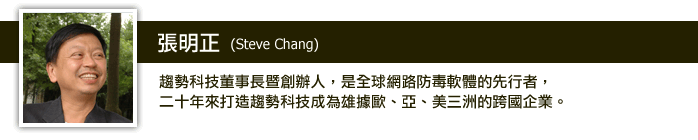 兩度獲得美國《商業週刊》推選為「亞洲之星」,為台灣創業家的代表。趨勢科技五度榮獲「台灣十大國際品牌」榜首(品牌價值估計13.26億美元),在創新、技術、經營管理方面更獲得國內外無數獎項的肯定,吸引哈佛商學院對其進行個案研究。