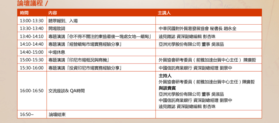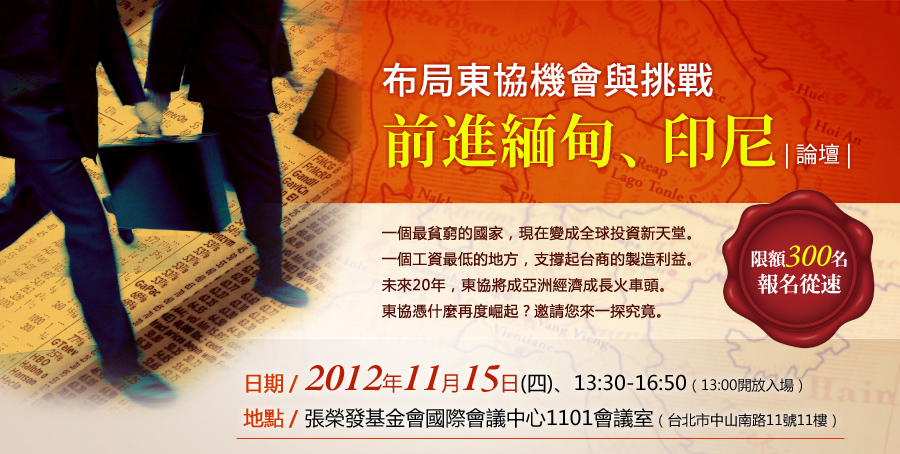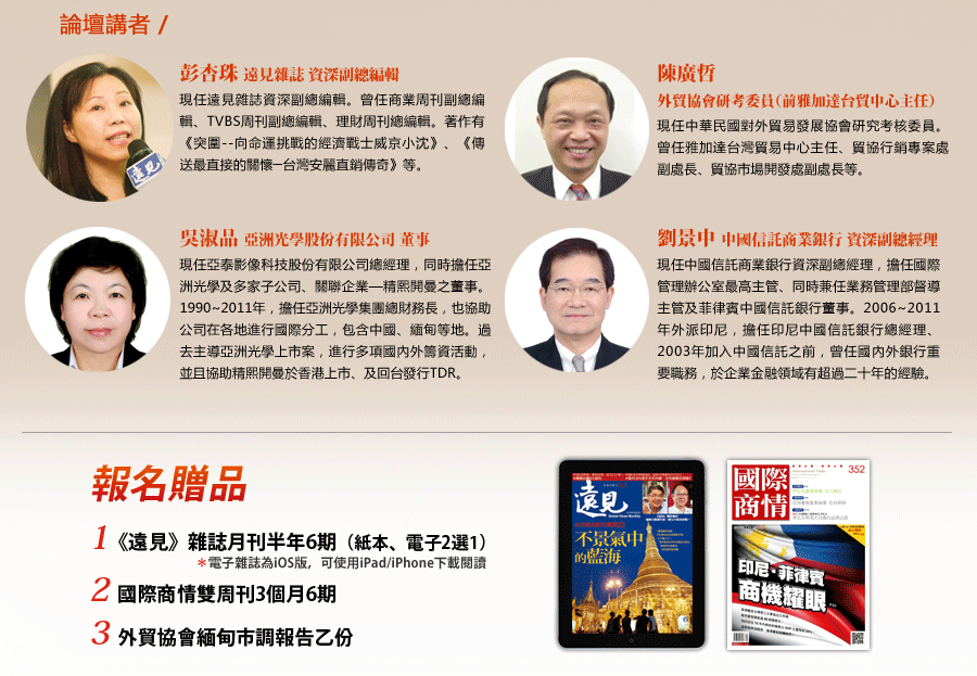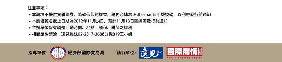 我已詳閱並同意報名完成視同同意以下條款:「遠見∙天下文化事業群、中華民國對外貿易發展協會《國際商情雙周刊》及各委外服務廠商基於客戶管理、統計及調查分析、會員管理、演講活動報名、行銷及其他合於營業登記項目或章程所定業務需要之特定目的,在此向您蒐集個人資料類別,作為本單位營運期間於台灣地區寄送出版物及各項優惠訊息及調查分析使用。您可請求查閱、提供複本、更正或補充個人資訊,及請求刪除或停止處理利用,請以電話或電子郵件連繫,遠見雜誌讀者服務部(02)2662-0012或service@cwgv.com.tw;週一至週五9:00~17:00,例假日除外。及《國際商情雙周刊》trade@taitra.org.tw客服0800-010-800或處理(若您填寫資料不完整時,可能會影響您收受出版物或優惠訊息的權利。) Copyright © 1999~2012 天下遠見出版股份有限公司. All rights reserved.天下文化/小天下/遠見雜誌/30雜誌/《哈佛商業評論》全球繁體中文版