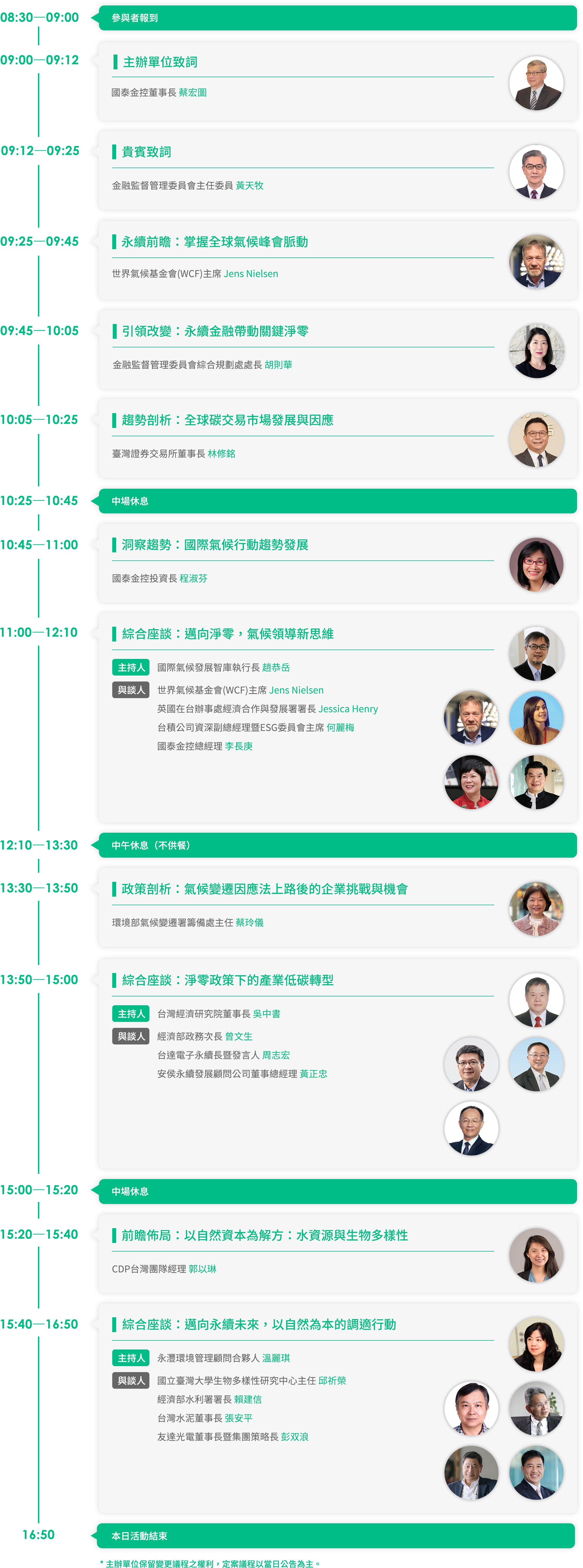 國泰金控連續七年,從國際到台灣,引領產業展開氣候行動。身為世界氣候基金會(WCF)在台首家全球策略夥伴,將邀請WCF主席來台,暢談國際氣候最新趨勢,並提升台灣淨零轉型及永續金融能見度。同時邀請台灣企業領導者分享如何將「永續」和「氣候變遷」納入商業思維與企業戰略,以迎戰氣候新賽局,展現氣候領導力。
