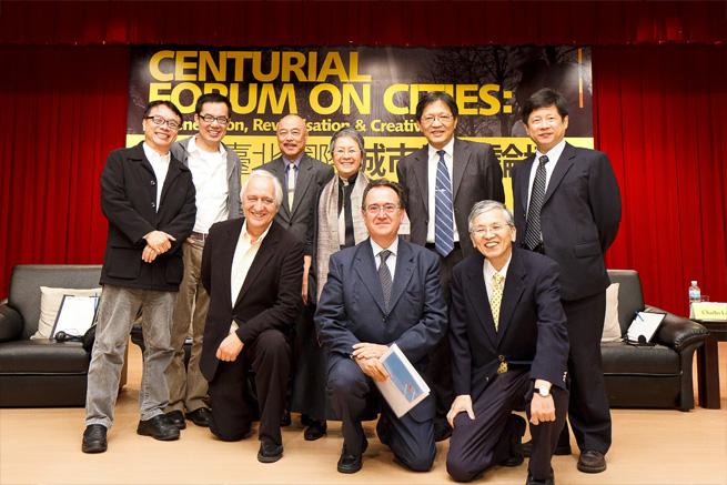 論壇參與貴賓會後合影(後排左至右:實踐大學林盛豐教授、東吳大學劉維公副教授、查維柴‧普羅馬達塔維迪先生、蕭麗虹老師、臺北市都發局丁育群局長、都更處林崇傑處長,前排蹲者由左至右:查爾斯‧蘭德利先生、尤漢.吉洛先生及台大林建元教授)。↓
