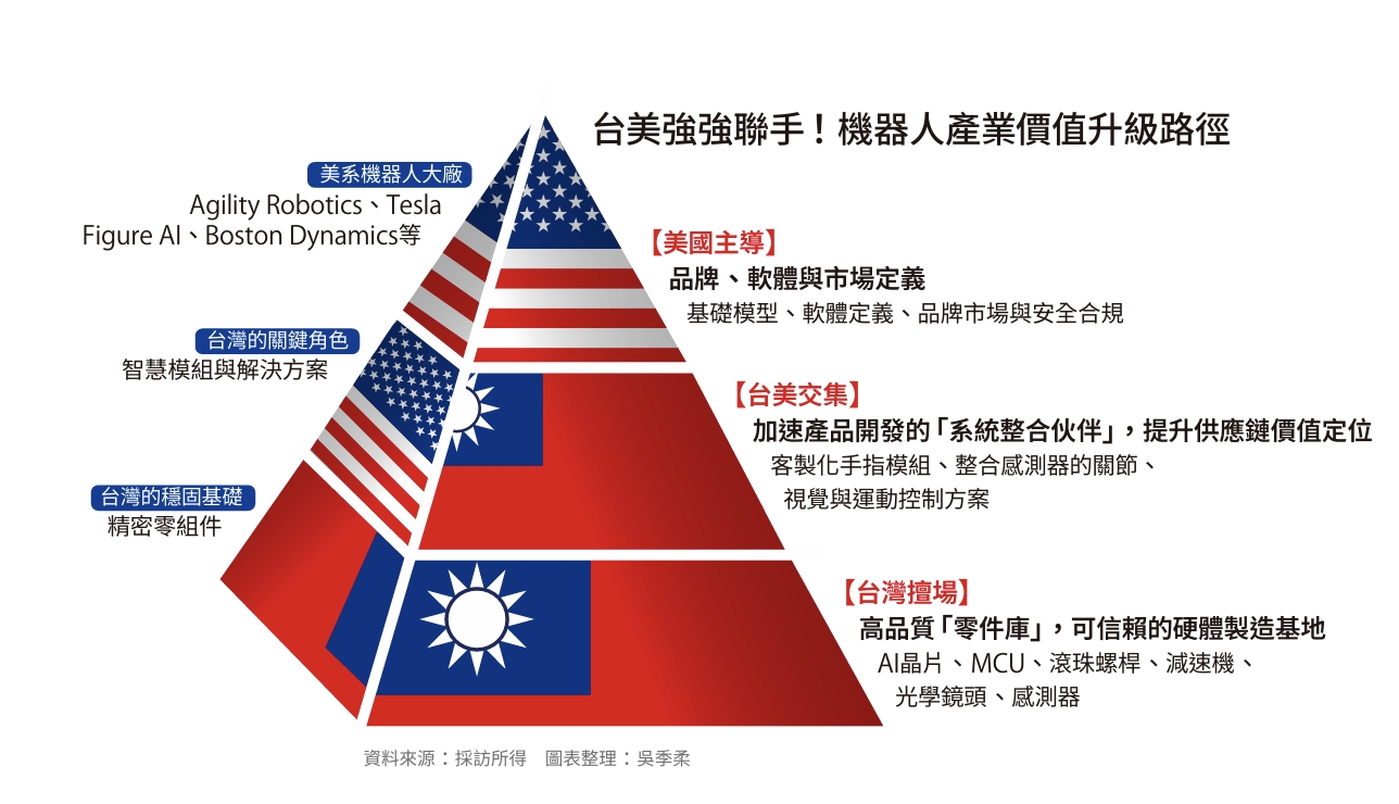 在實體AI的浪潮下,台美合作正迎來黃金契機。美國的強項在於主導AI大腦(軟體與數據模型),而台灣則擁有發展機器人身體(硬體製造與整合技術)的絕佳機會,雙方能形成完美的互補。從晶片、感測器到系統整合,台灣掌握了將頂尖演算法付諸實現的硬體製造實力。這場由實體AI點燃的全球供應鏈重組戰役,正是台美合作掀起軟硬整合新革命的完美時刻。